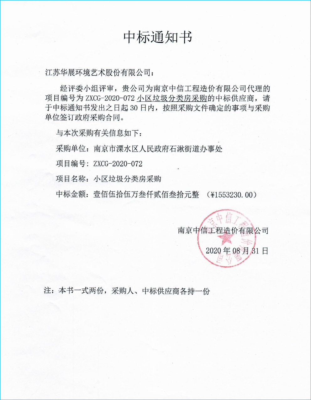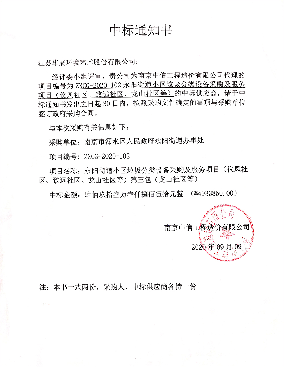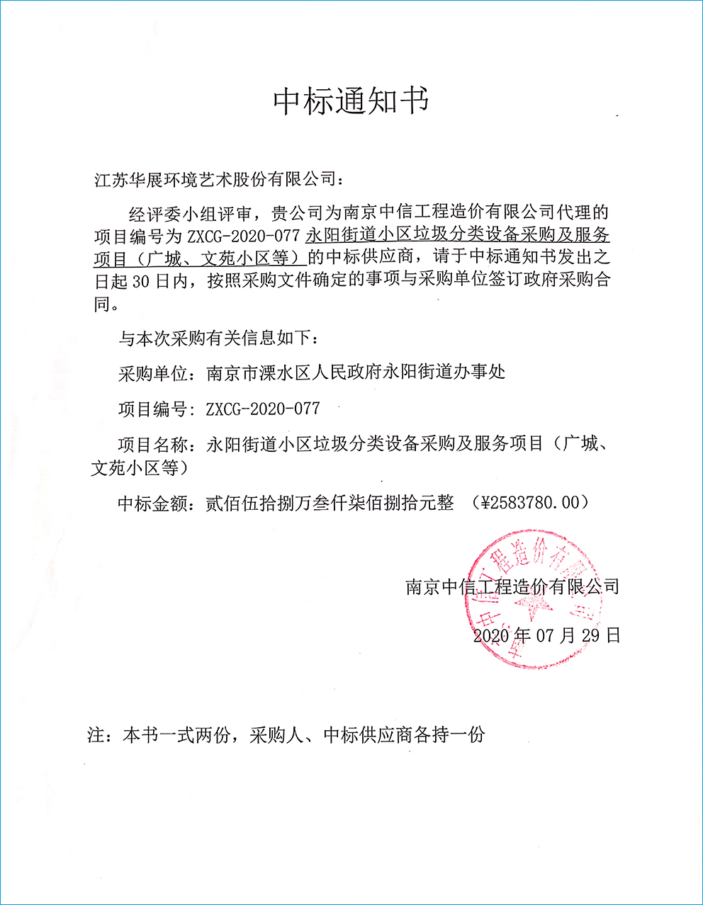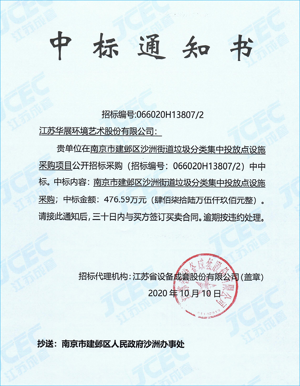 【中標(biāo)通知】江蘇省南京建鄴區(qū)沙洲街道垃圾分類集中投放點(diǎn)設(shè)施采購項目